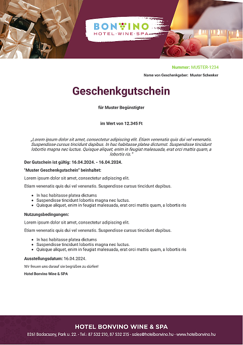 - Der Gutschein kann für jede beliebige Dienstleistung des Hotels**** Bonvino Wine & Spa innerhalb der auf dem Gutschein angegebenen Gültigkeitsdauer eingelöst werden.